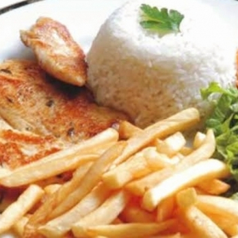 Acompanha arroz, feijão, batata frita e salada