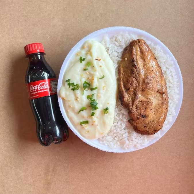 Marmita com delicioso filé de frango grelhado acompanhado de arroz branco, feijão e purê de batata inglesa. Acompanha refrigerante pet Coca Cola bem gelado. Marmita indicada para 01 pessoa.