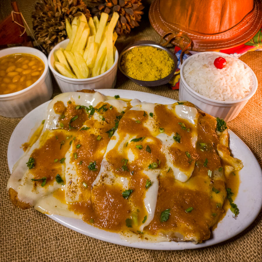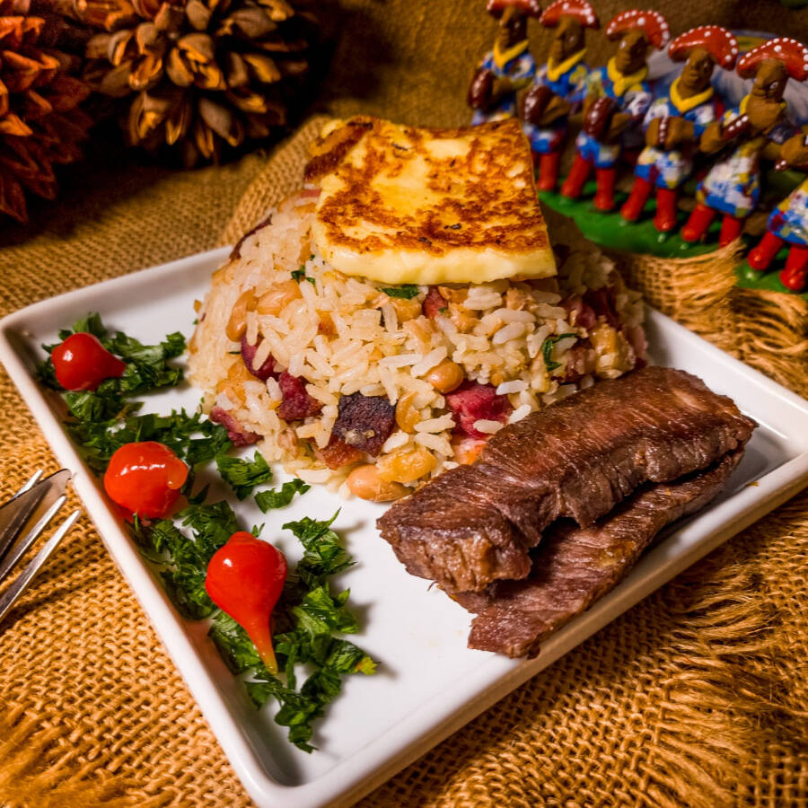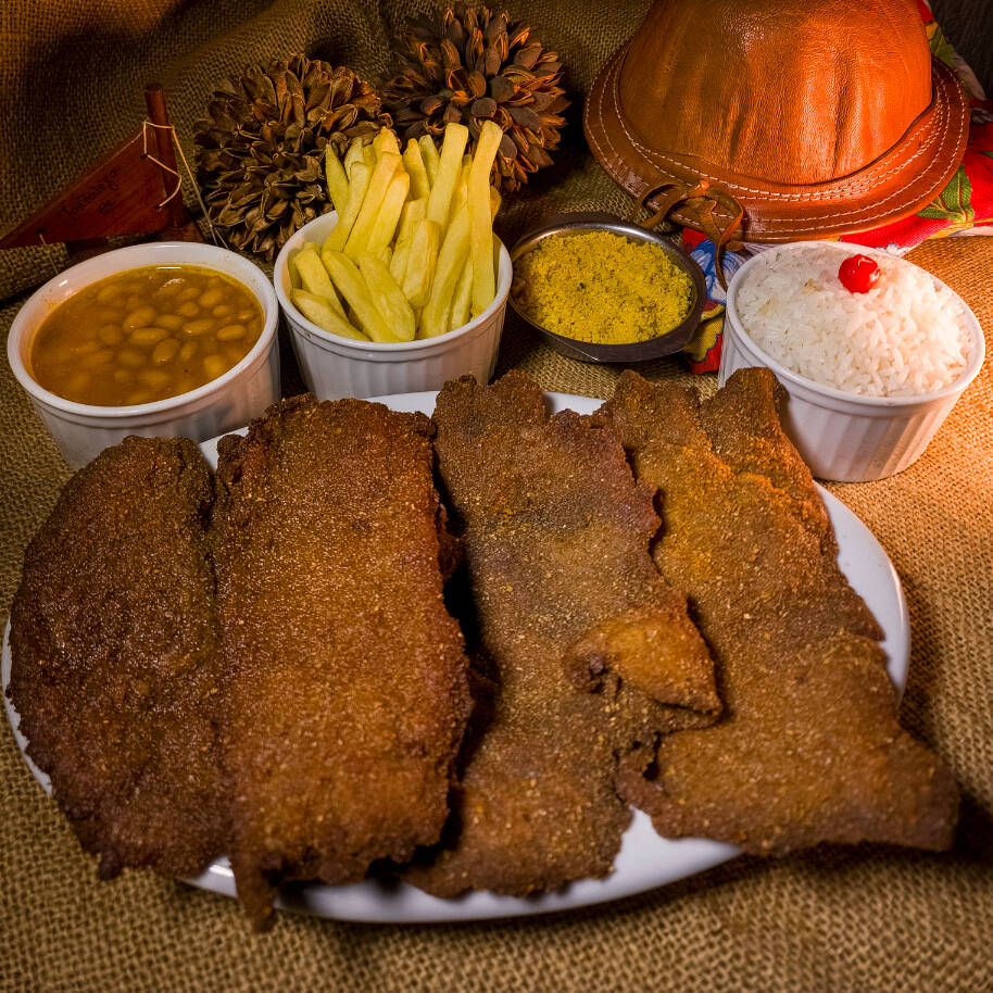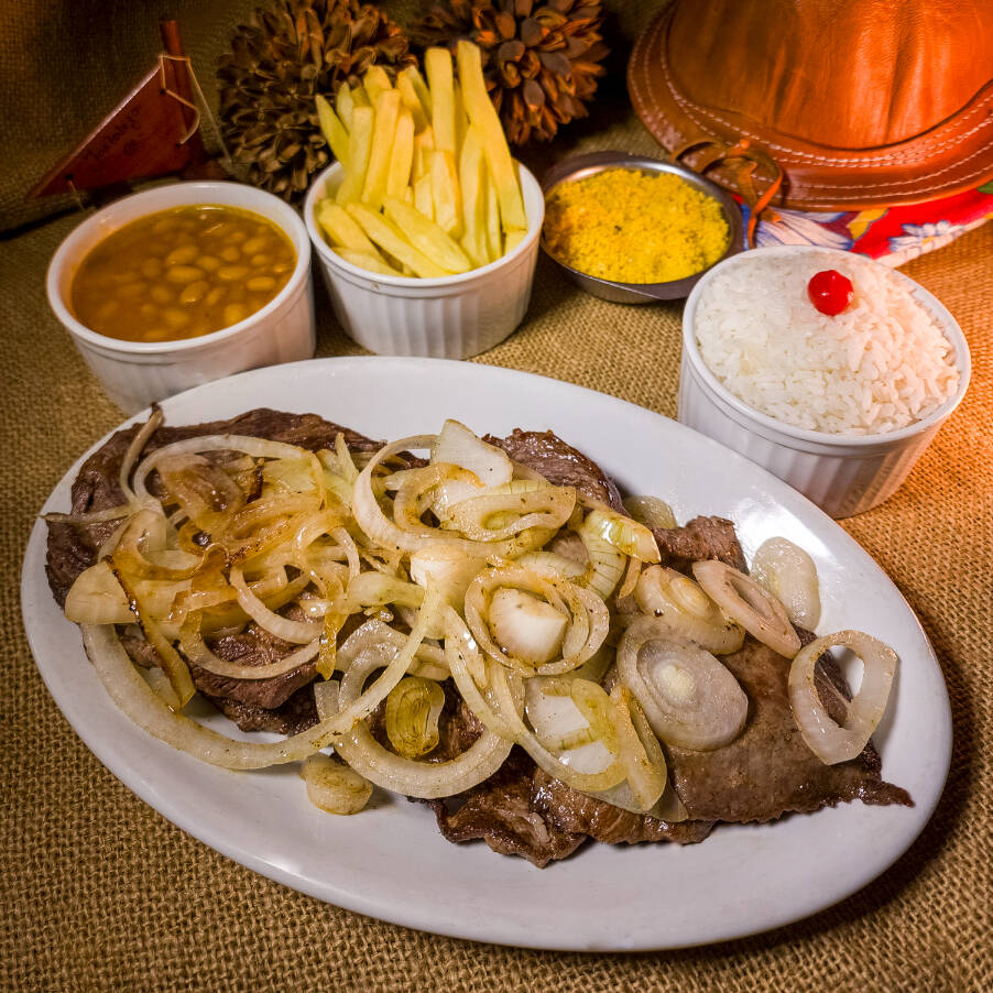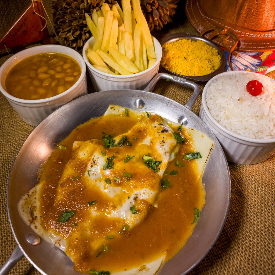Esse prato é mais conhecido como ´´Chapéu de Couro, uma homenagem aos trabalhadores do nordeste. Carne seca desfiada acebolada acompanhada de 2 ovos fritos, queijos coalho grelhado, arroz, feijão, mandioca frita e farofa. Serve até 3 pessoas. Tempo De Preparo: 30 Minutos