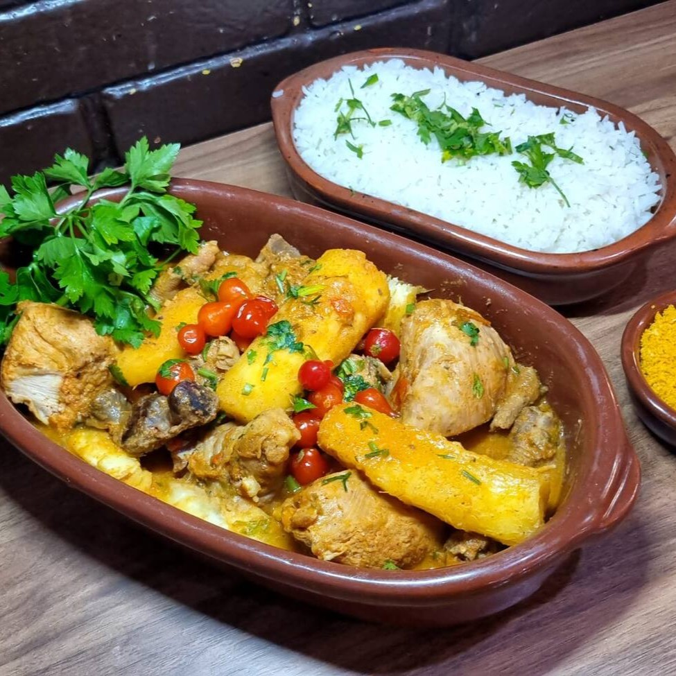 Cozido de frango com mandioca. Acompanha arroz branco e farofa. Serve 2 pessoas . Tempo De Preparo: 30 Minutos