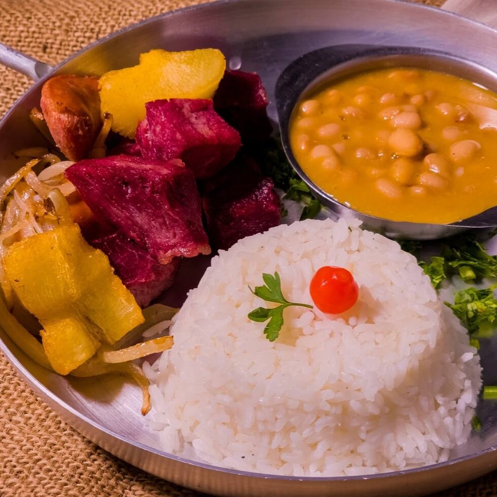 Desperte seu paladar com o autêntico 'Baião De 10 Grande', uma verdadeira celebração do sabor do sertão brasileiro! Este prato robusto e saboroso é composto por arroz bem temperado, feijão carioca suculento, carne seca desfiada, bacon crocante, queijo coalho derretido, torresmo estaladiço, calabresa apimentada, costelinha tenra e banana grelhada para um toque adocicado. Ideal para compartilhar, pois serve até 4 pessoas. Lembre-se de solicitar talheres, se necessário. Uma refeição autêntica e satisfatória te espera! Tempo De Preparo: 30 Minutos