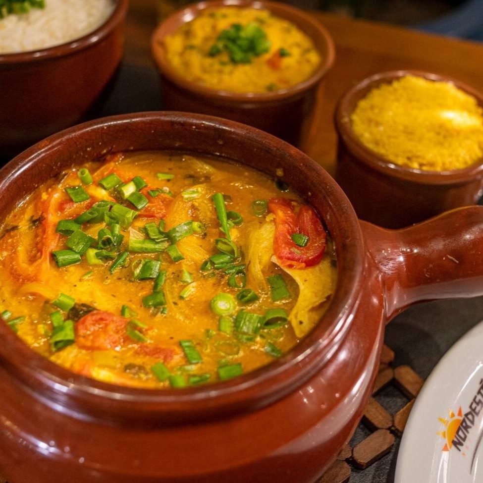 A típica Moqueca Baiana pertinho de você !!! Peixe e Camarão ao leite de Coco e Azeite de Dendê acompanha Arroz Branco, Pirão de Peixe e Farofa de Dendê. Tempo De Preparo: 30 Minutos *pedir talher se for necessário