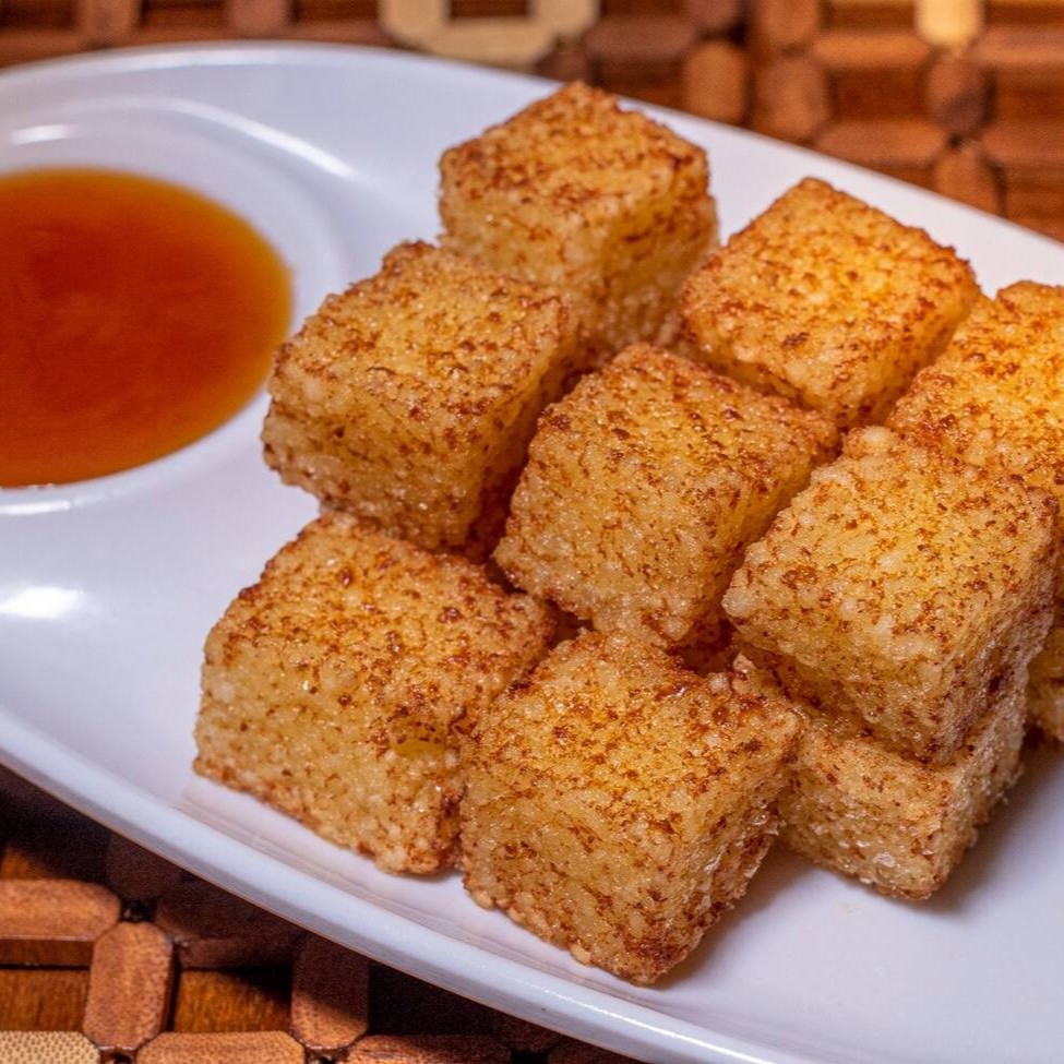 A Clássica mistura entre a tapioca e o queijo coalho!!! Porção de 10 Quadradinhos de Tapioca com Queijo Coalho e acompanha molho agridoce apimentado .