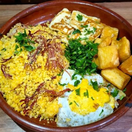 Vocês pediram e nós atendemos!!!! Aquele gostinho do Nordeste em forma de Cuzcuz de flocos de milho com carne seca desfiada acompanhado de 2 ovos fritos, Queijo Coalho Grelhado, Mandioca Frita e Torresminho frito . Serve 2 a 3 Pessoas!!! Tempo De Preparo: 30 Minutos