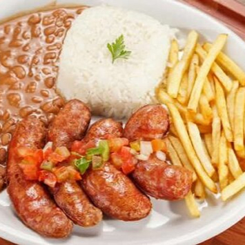 Arroz, feijão, farofa, salada do dia, fritas e linguiça toscana