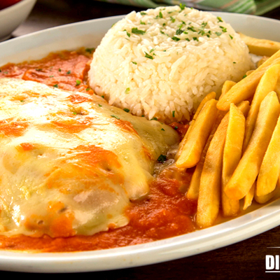 Arroz, feijão, fritas, salada do dia e filé de frango à parmegiana