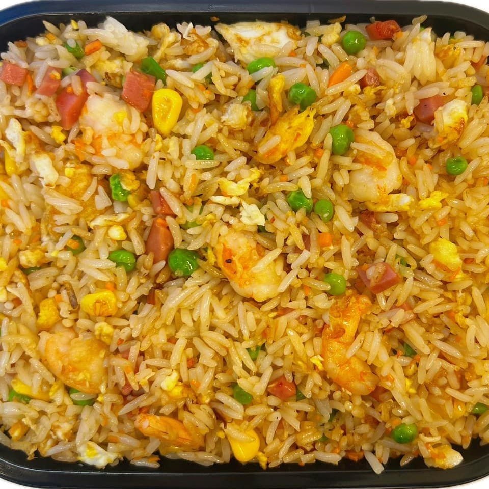 Sabor caseiro, preparado no wok com arroz soltinho, ovo mexido, salsicha e legumes frescos (cenoura, ervilha) + camarões picados