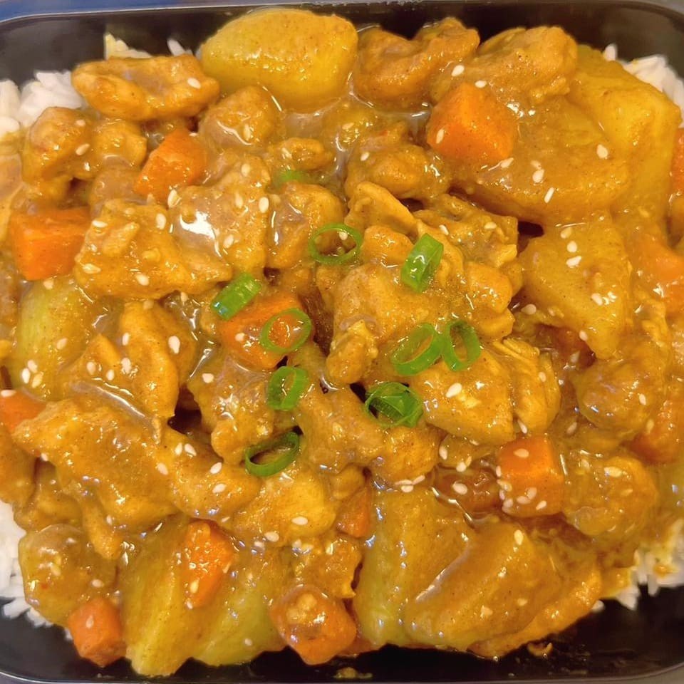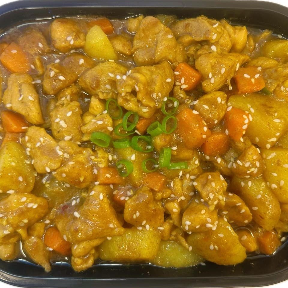 Frango, batata, cenoura, com molho de curry à moda de Hong Kong