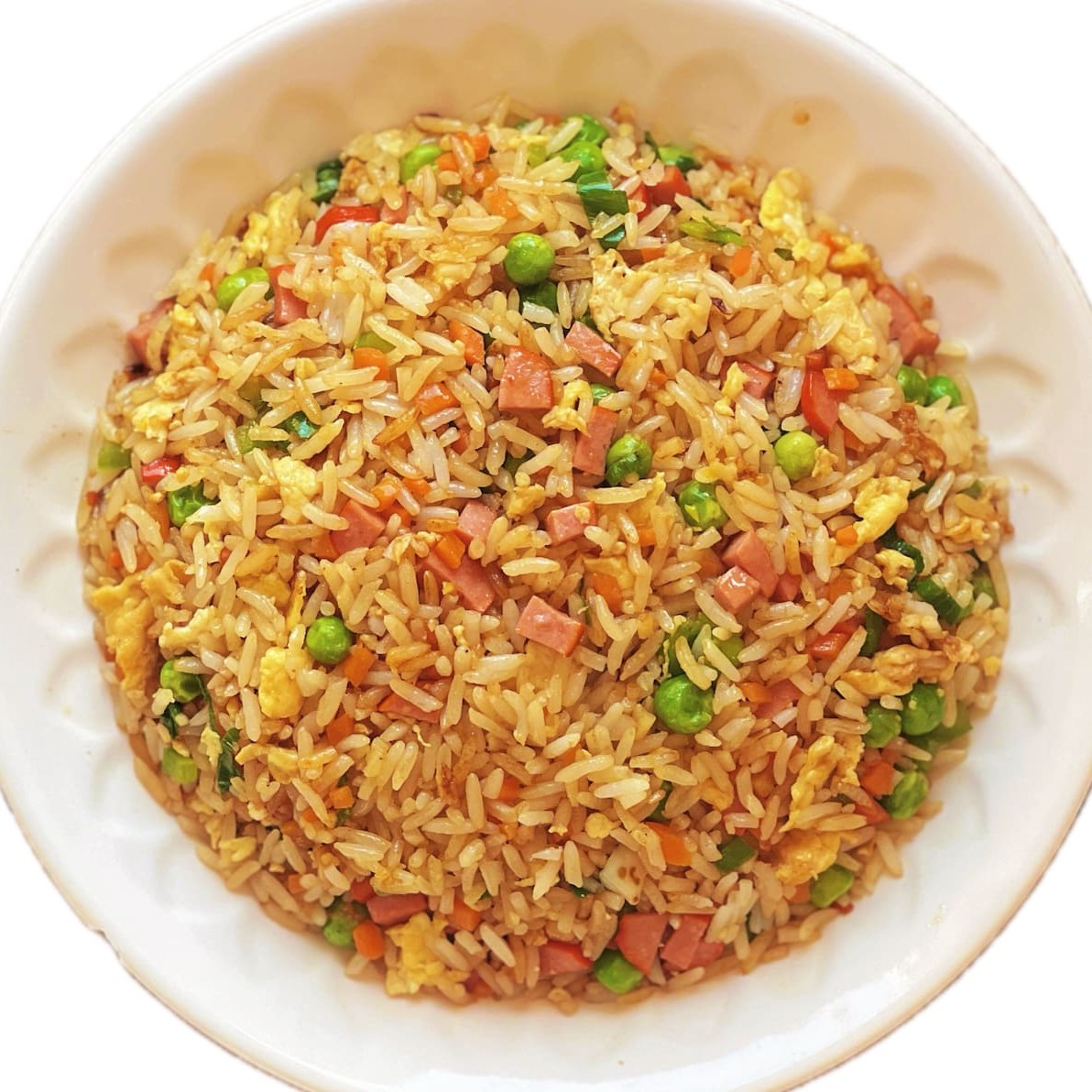 Sabor caseiro, preparado no wok com arroz soltinho, ovo mexido, salsicha e legumes frescos (cenoura, ervilha).