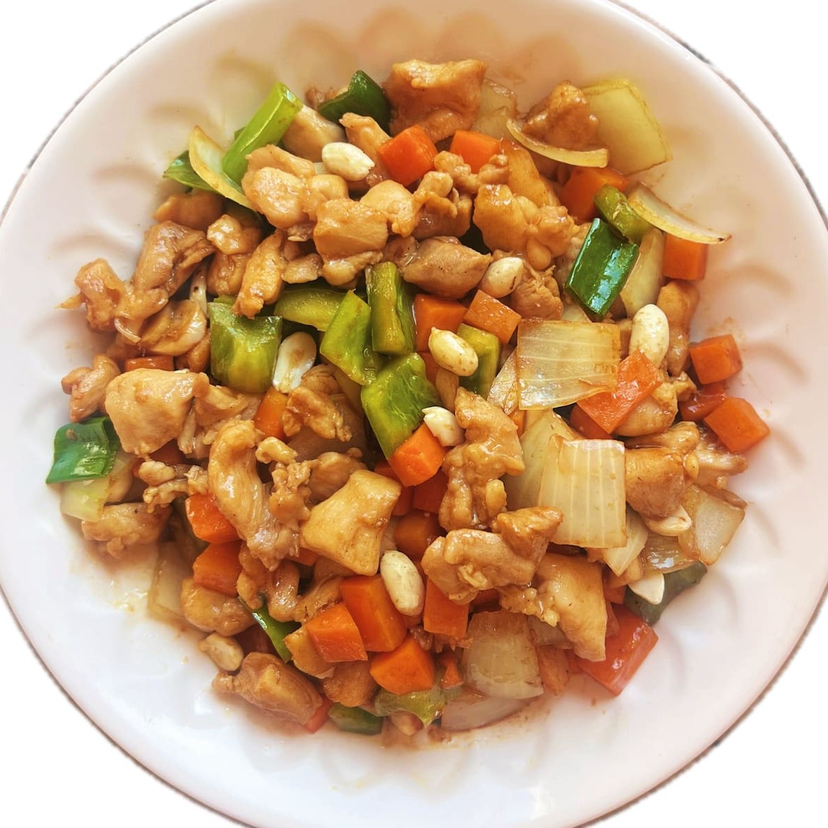 Cubos de frango, cenoura, cebola, cebolinha e amendoim torrado. Um clássico oriental cheio de sabor e textura.