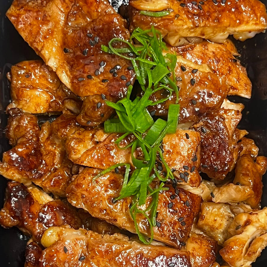 Frango grelhado em tiras, ao molho Teriyaki, gergelim e cebolinha.