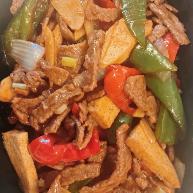 Um prato criativo do chef de Pinjen. Carne bovina, tofu, pimentão verde e vermelho, cebola, cebolinha, gengibre, alho, pimenta do reino e cominho.