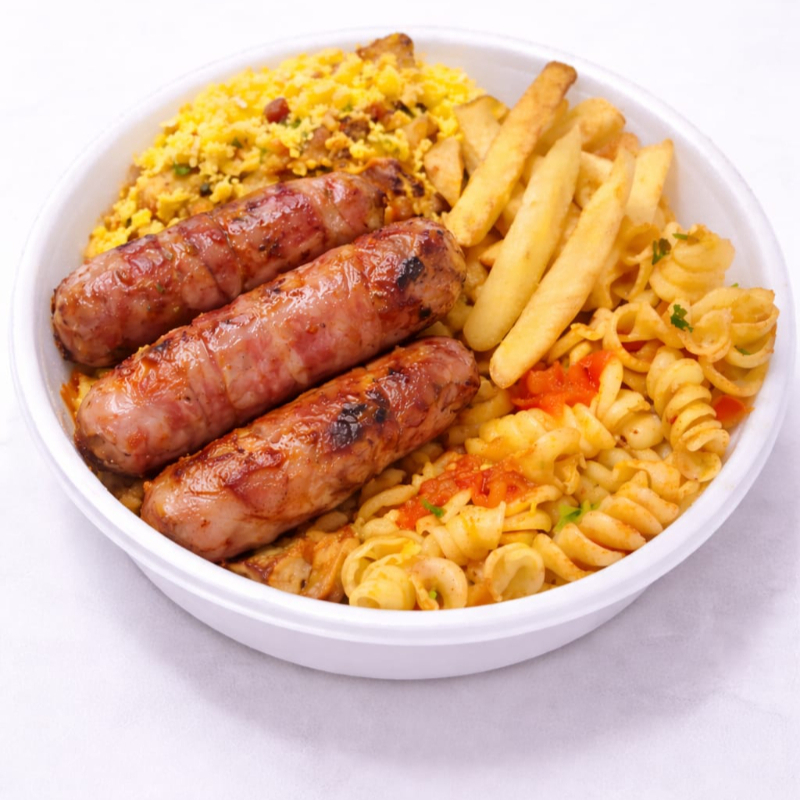 Arroz ,macarrão, feijão, farofa , fritas mais calabresa com cebola