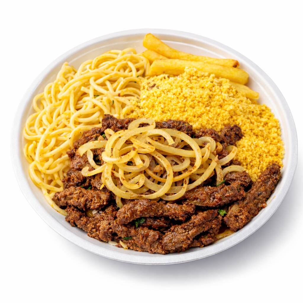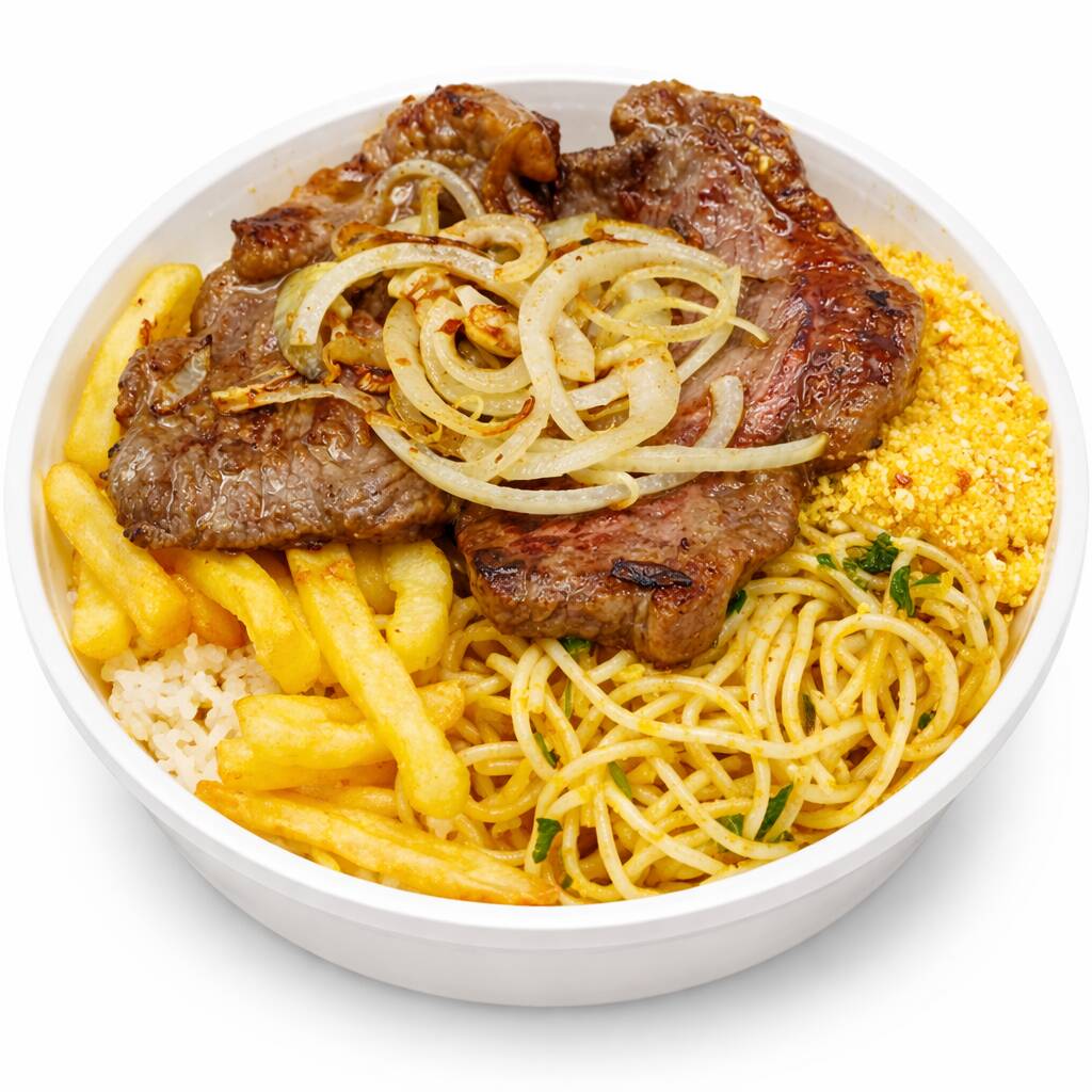 arroz ,macarrão, feijão ,farofa , batata frita, contra file com cebola