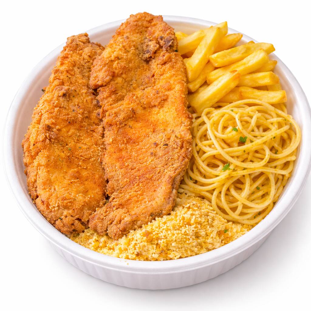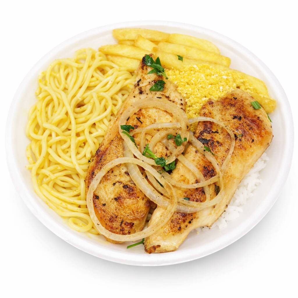 Arroz, macarrão, feijão, filé de frango, farofa e batata frita