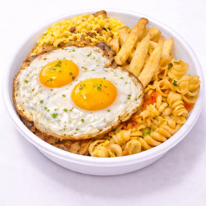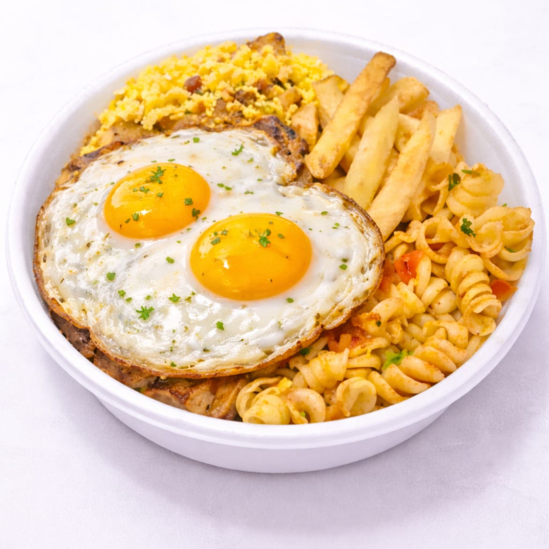 Arroz macarrão feijão batata frita farofa e 2 ovos