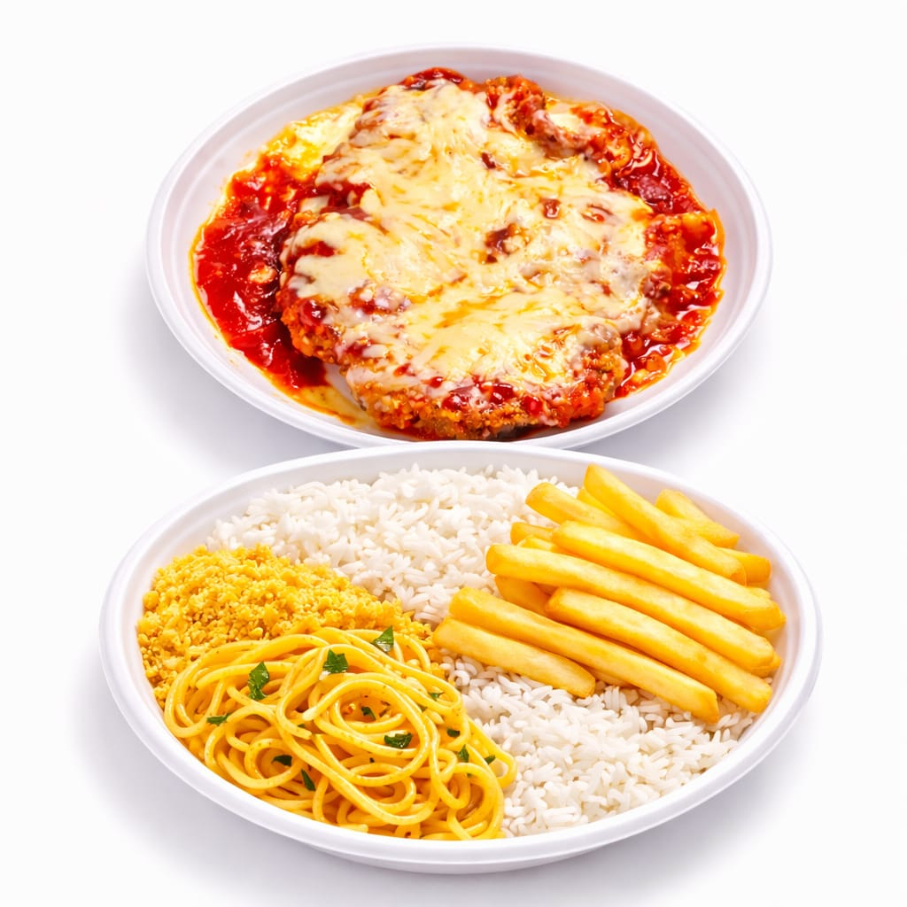 Arroz, macarrão, feijão, parmegiana de frango, farofa e batata frita.