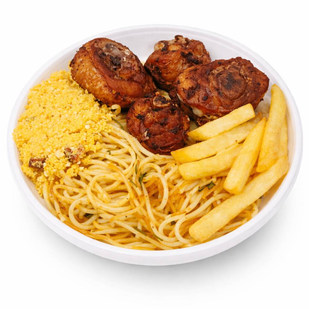 Arroz macarrão feijão fritas farofa e frango