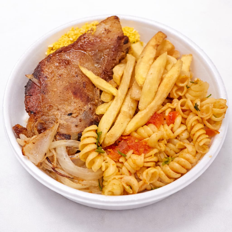 Arroz, macarrão, feijão, bisteca, farofa e batata frita