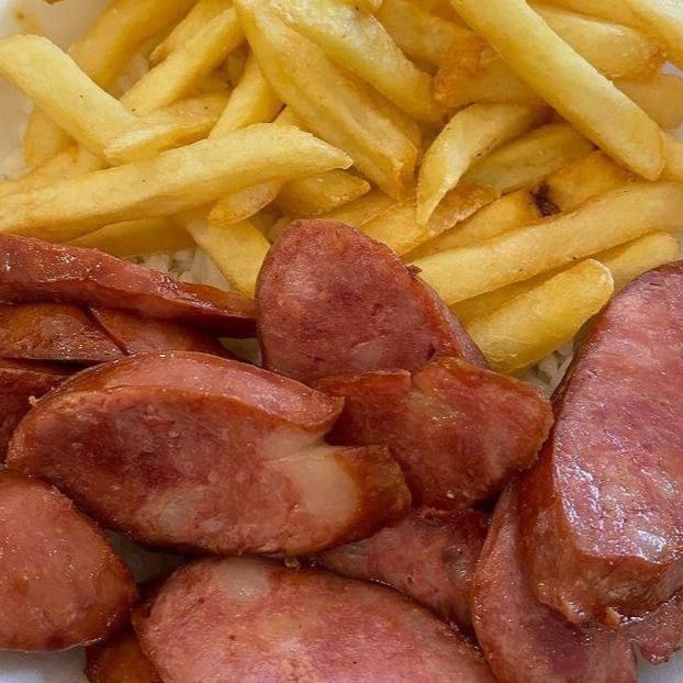 Desfrute da nossa 'Marmita Calabresa Defumada', uma opção econômica e saborosa da categoria 'Pratos e Marmitas que Cabem no seu Bolso'. Este prato é composto por arroz soltinho, feijão temperado, salada fresca e crocante, acompanhado de fritas douradas ou purê cremoso ou um ovo perfeitamente cozido. Uma refeição caseira, ideal para o seu almoço ou jantar. #Marmita #Prato #Almoço #Jantar #Comida #Comidacaseira #Bom e Barato.