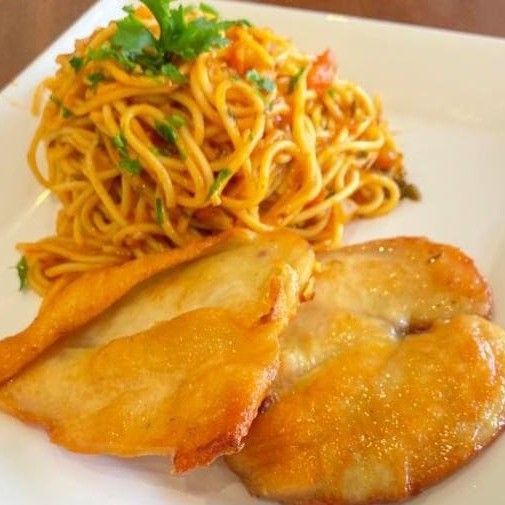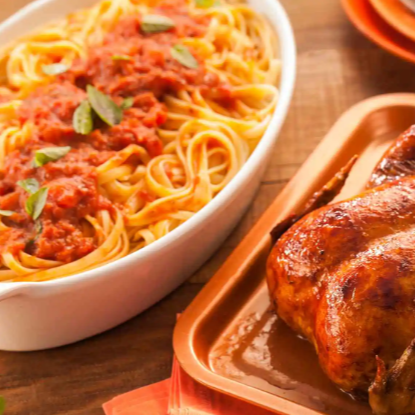 Espaguete com Frango Assado, preparado com massa al dente e tempero especial, acompanhado de frango assado suculento e bem dourado.