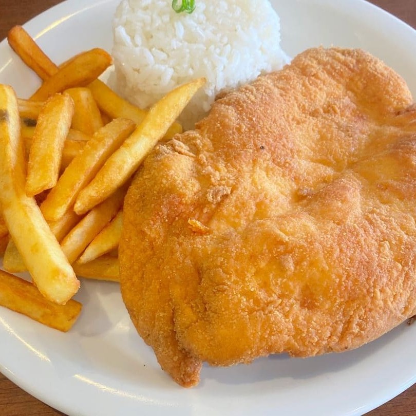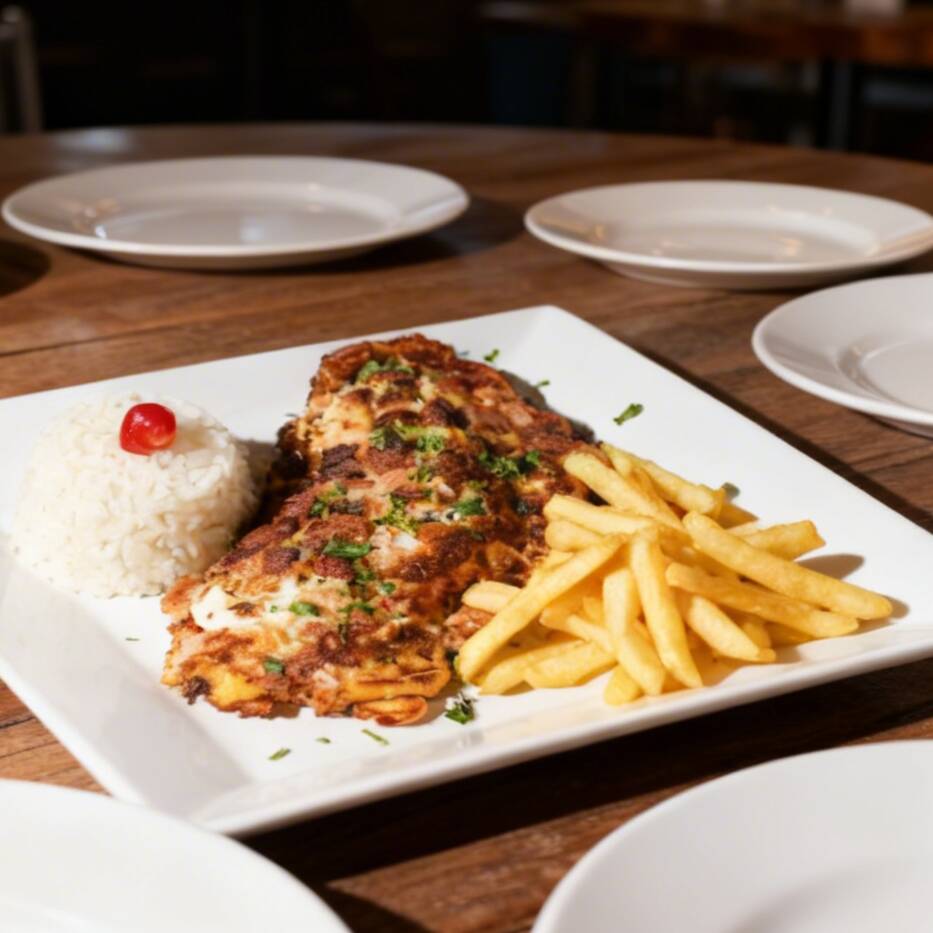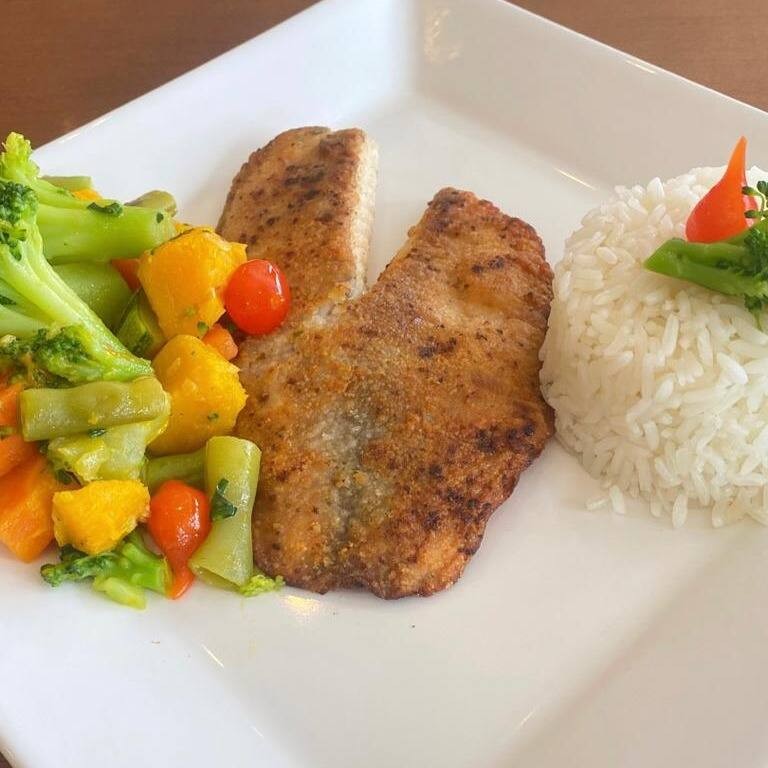 Filé de Peixe à Milanesa, crocante por fora e macio por dentro, acompanhado de arroz soltinho, feijão caseiro, purê de batata cremoso e batatas fritas douradas.