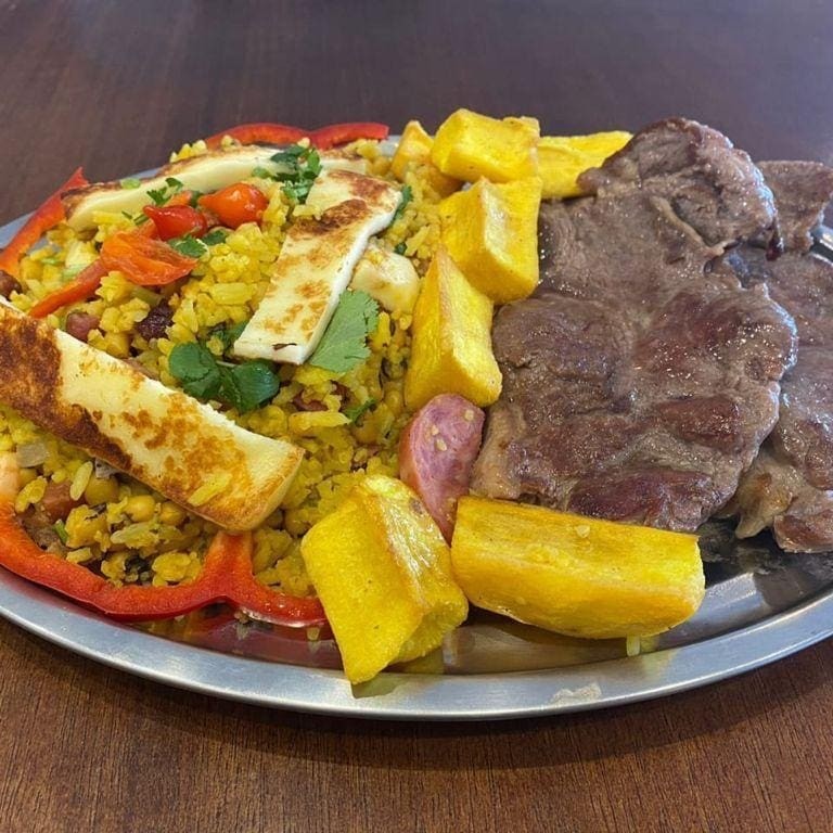 Delicie-se com nossa Marmita Baião de Dois Pequeno com Contrafilé, da categoria Pratos e Marmitas de Baião de Dois. Este prato traz o autêntico Baião de Dois, primorosamente preparado com Feijão Fradinho, Pimentões coloridos, pitadas de Pimenta Biquinho, Calabresa Fatiada, Bacon em cubos crocantes e uma generosa fatia de Queijo Coalho derretido. O prato é coroado com um suculento e generoso Bife de Contrafilé, perfeitamente grelhado. Acompanha mandioca macia e uma fresca salada, proporcionando uma refeição completa e saborosa. Ideal para o seu almoço ou jantar, trazendo a nostalgia e o aconchego da comida caseira. #Marmita #Prato #Almoço #Jantar #Comida #Comidacaseira