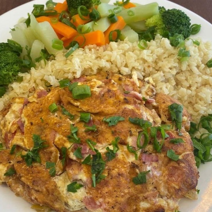 Apresentando nosso Omelete Especial, cuidadosamente preparado com dois ovos frescos, tomate suculento, presunto de primeira e mussarela derretida. Este prato é realçado com o autêntico e saboroso Catupiry, além de ser incrementado com pedaços crocantes de bacon. Este prato maravilhosamente composto é servido com acompanhamentos à sua escolha: Arroz bem temperado, Feijão caseiro, Salada fresca, Batatas fritas crocantes ou purê aveludado ou um ovo. Perfeito para seu almoço ou jantar, trazendo o gostinho da comida caseira para a sua mesa. #Marmita #Prato #Almoço #Jantar #Comida #Comidacaseira