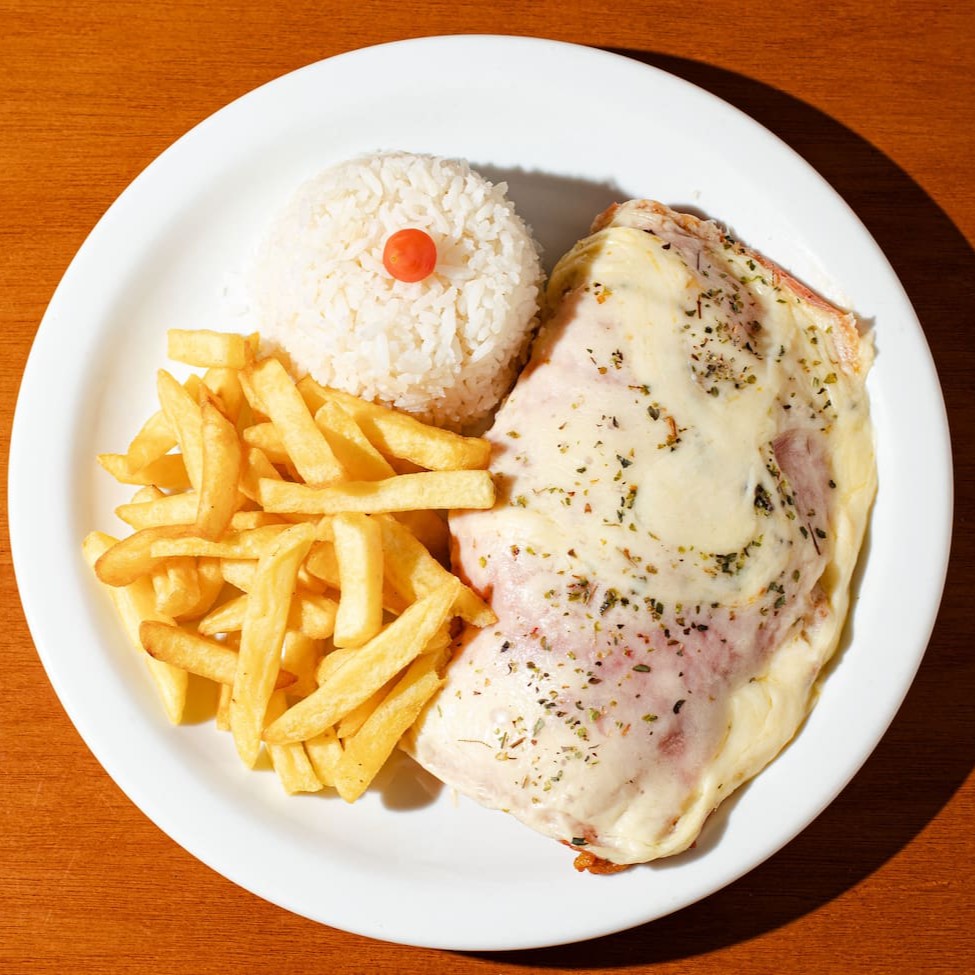 Contrafilé grelhado, macio e suculento, servido com arroz soltinho e feijão bem temperado. Acompanhamento à escolha: fritas crocantes, purê cremoso ou ovo. Para completar, Coca-Cola 350ml bem gelada.