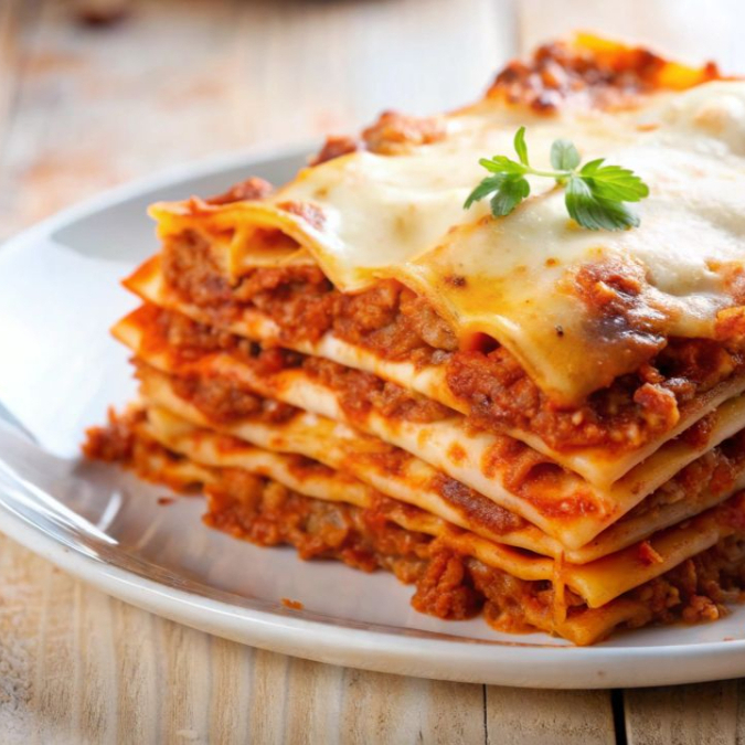 Lasanha à Bolonhesa, preparada com molho de carne bem temperado e camadas generosas de massa e queijo, acompanhada de arroz soltinho e batatas fritas crocantes.