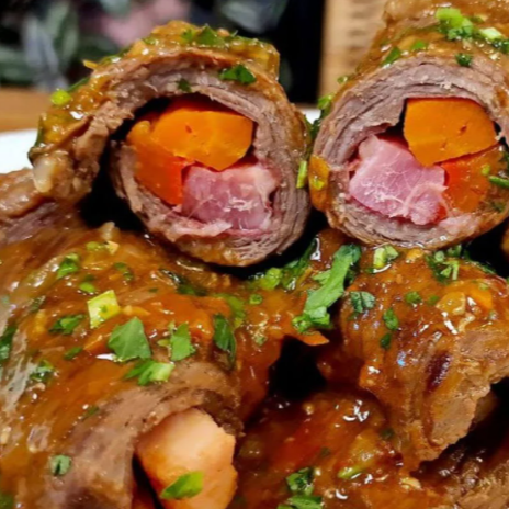 Bife à Rolê ao Molho, macio e bem temperado, preparado lentamente até ficar suculento, acompanhado de arroz soltinho, feijão caseiro e purê cremoso.