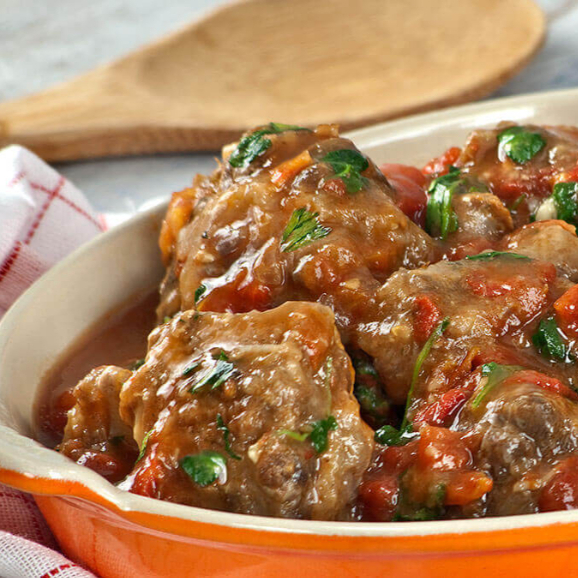 Rabada ao molho, macia e suculenta, cozida lentamente até ficar bem saborosa, acompanhada de arroz soltinho, polenta macia e agrião fresco.