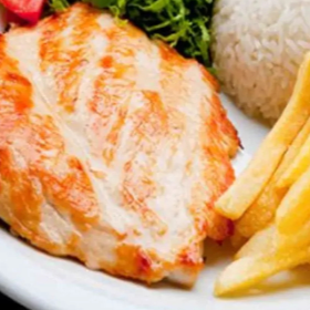 Filé de frango grelhado, suculento e bem temperado, acompanhado de arroz soltinho e feijão fresquinho. Escolha entre fritas crocantes, purê cremoso ou ovo. Uma marmita completa e feita com sabor de comida caseira.
