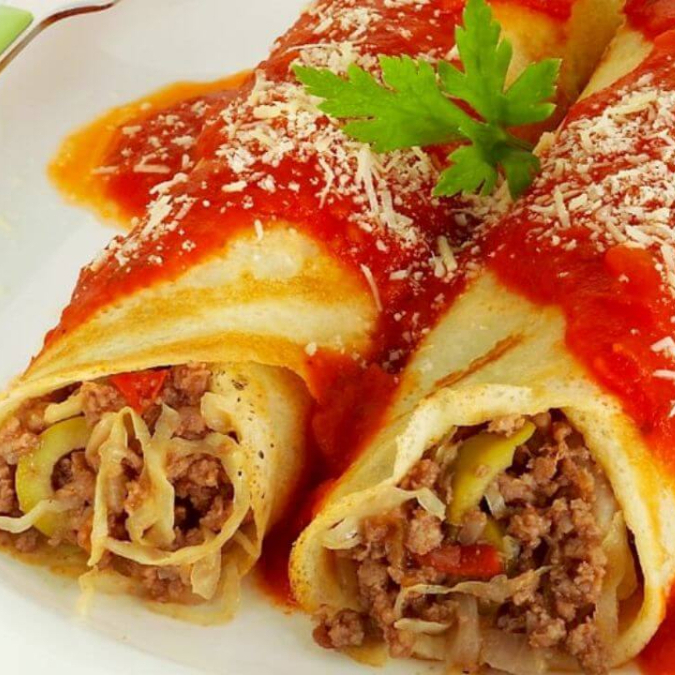 Panqueca de Carne, recheada com carne bem temperada e coberta com molho saboroso, acompanhada de arroz soltinho e batatas fritas crocantes.