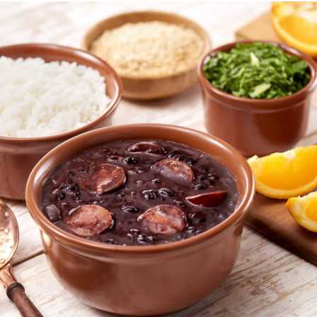 Feijoada saborosa acompanhada de arroz soltinho, couve refogada, banana frita, farofa, torresmo crocante e bisteca suculenta. Acompanha molho de pimenta à parte.