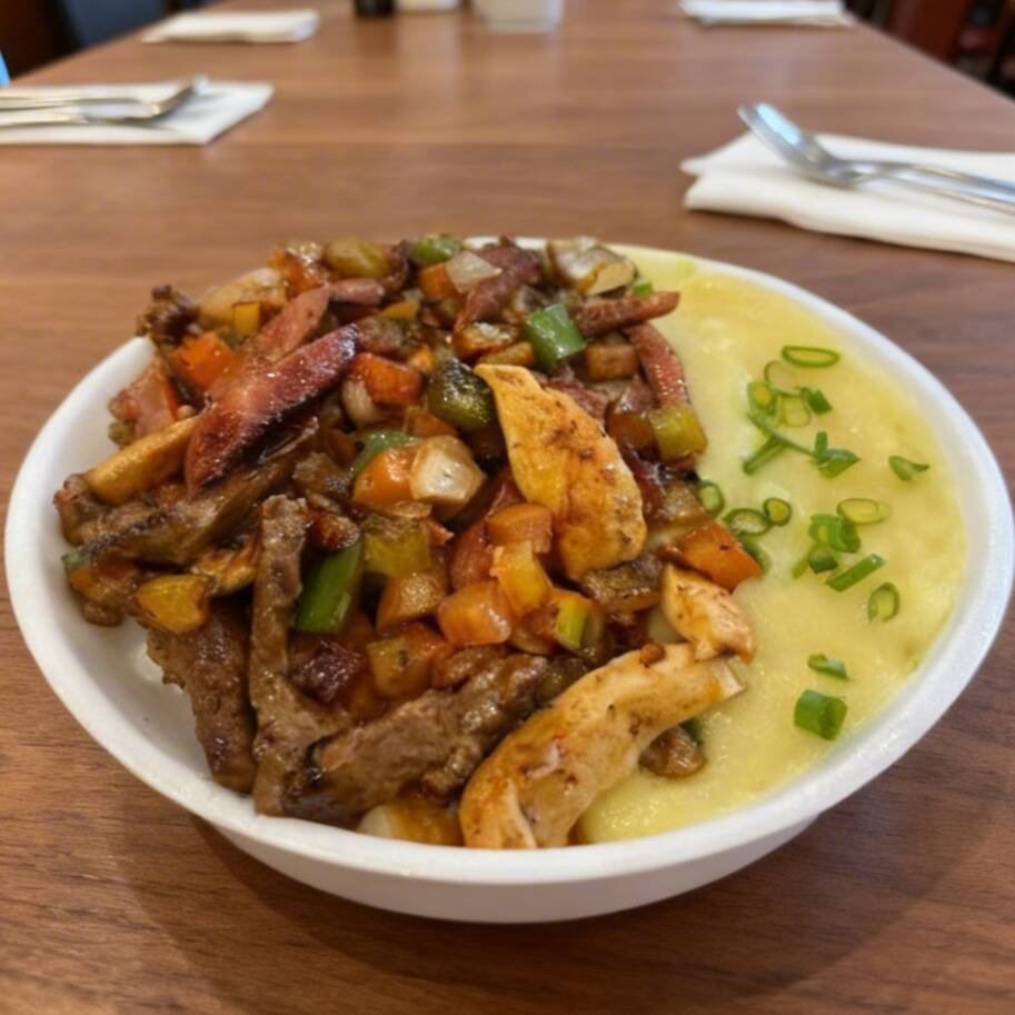 A 'Marmita Espeto Misto' é uma saborosa combinação de filé de frango, calabresa e suculentas tiras de bife, cozido em um rico vinagrete ao molho shoyu, que lhe confere um sabor exótico e inigualável. Acompanha arroz soltinho, feijão caseiro e a escolha entre batatas fritas crocantes, purê cremoso ou um ovo perfeitamente frito. Uma deliciosa opção para o almoço ou jantar, esta marmita de comida caseira irá satisfazer o seu paladar e nutrir o seu corpo. #Marmita #Prato #Almoço #Jantar #Comida #Comidacaseira