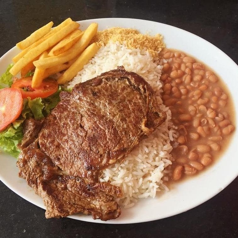 Arroz branco soltinho, feijão bem temperadinho, bife acebolado, batata frita e salada.