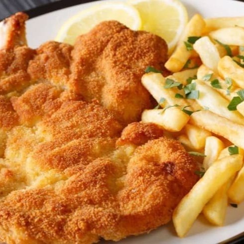 Frango a parmegiana com molho de tomate e queijo derretido, arroz branco soltinho, feijão, batatinha frita e salada. Serve bem 1 pessoa.