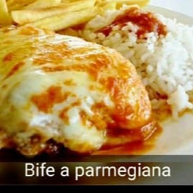 Bife a parmegiana com molho de tomate e queijo derretido, arroz branco soltinho, feijão, fritas e saladinha. Serve bem 1 pessoa.