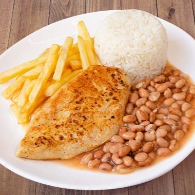 Filé de frango grelhado com arroz branco soltinho, feijão bem temperado, batata frita e salada. Serve bem 1 pessoa