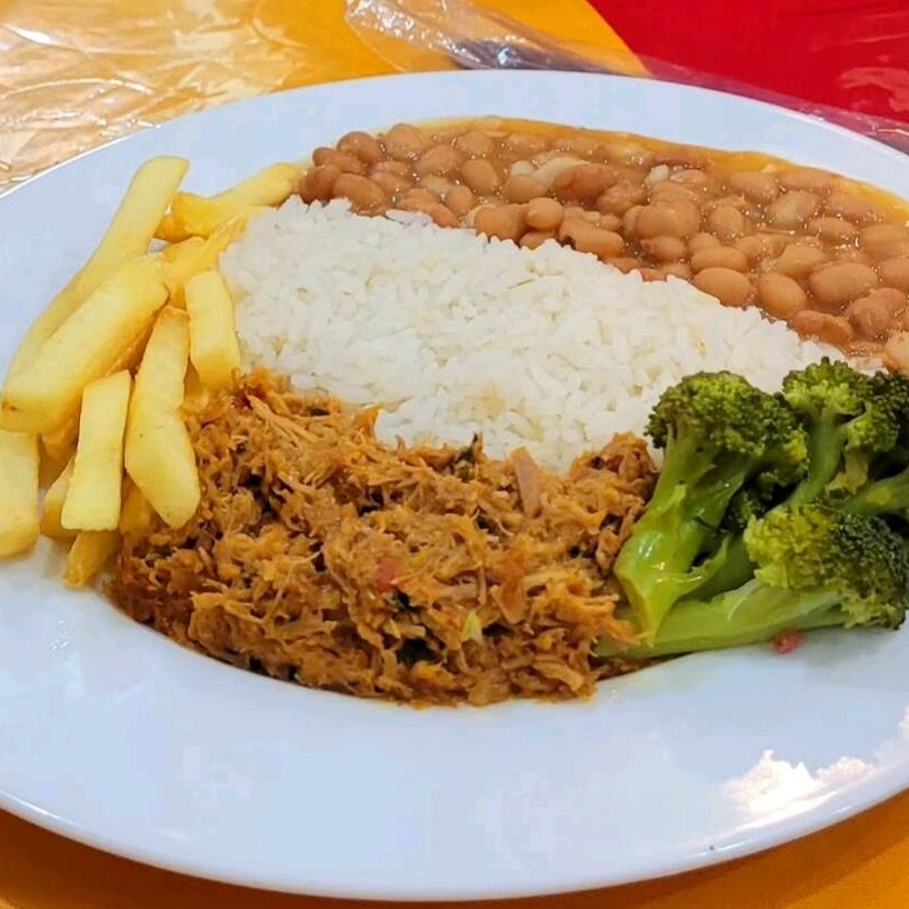 Nossa Marmitex de Pernil desfiado Acompanha: Arroz branco, Feijão Carioca, Macarrão ou legumes do Dia, fritas e salada!