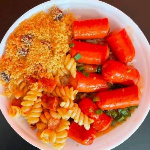 Marmitex de Salsicha ao molho, Acompanha: Arroz branco, Feijão Carioca, Macarrão ou legumes do Dia, fritas e salada!