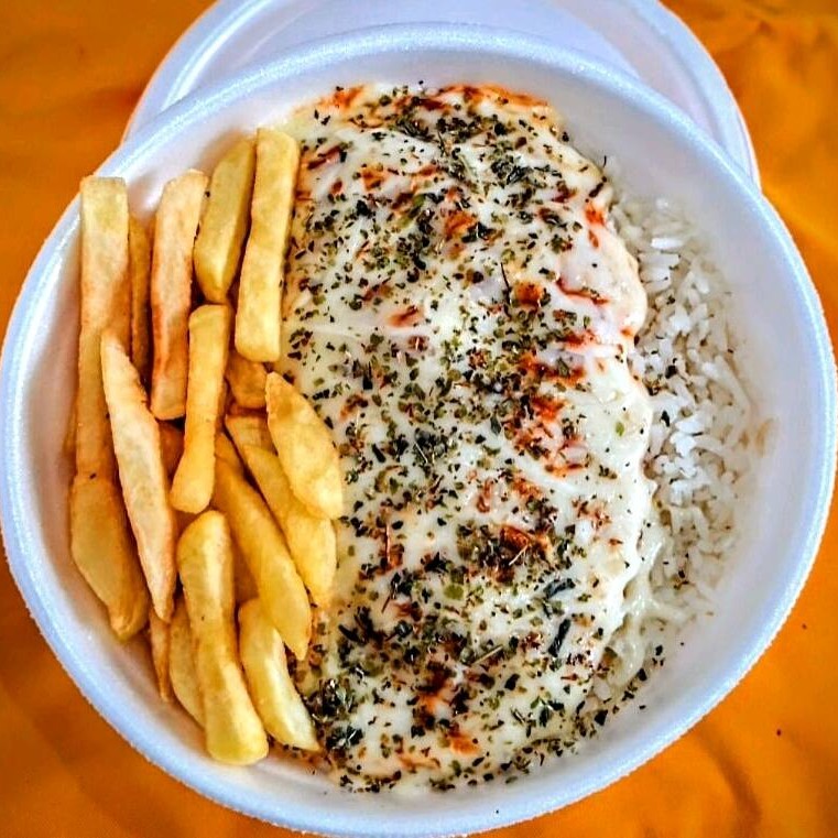 Marmitex de Parmegiana acompanha: Arroz, Feijão, Fritas e Salada.