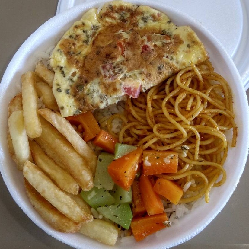 Nossa Marmitex de Omelete completa acompanha: Arroz Branco, Feijão Carioca, Macarrão ou legumes do Dia, fritas e salada!