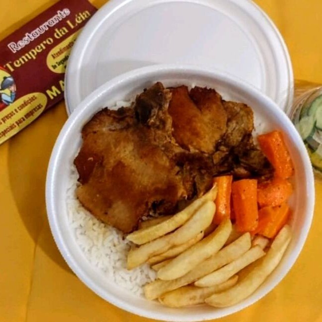 Marmitex de Bisteca frita acompanha: Arroz branco, Feijão Carioca, Macarrão ou legumes do Dia, Fritas e Salada.