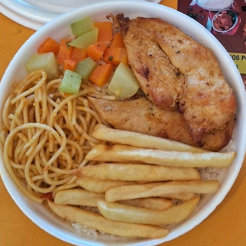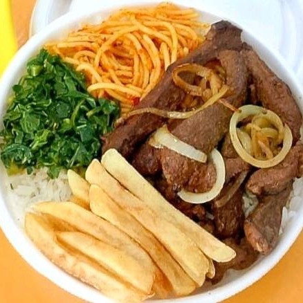 Acompanha: Arroz Branco, Feijão Carioca, Macarrão, Fritas e salada!
