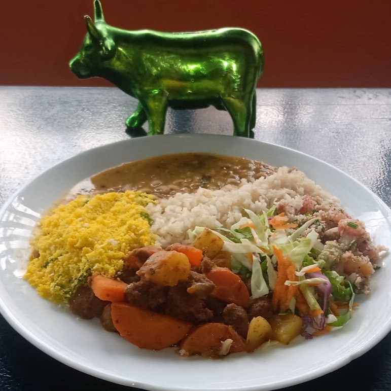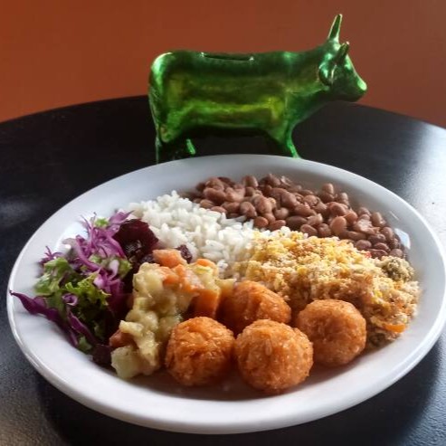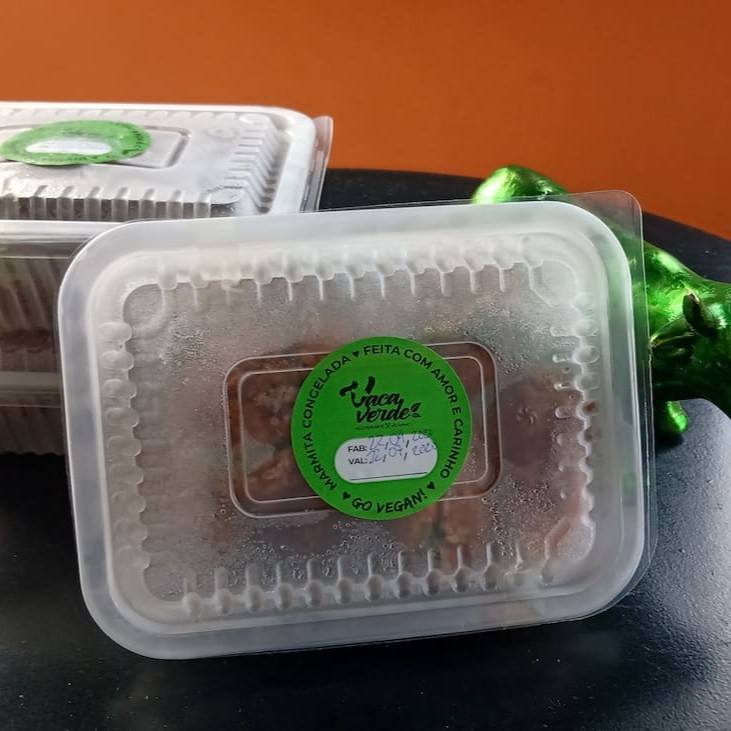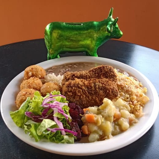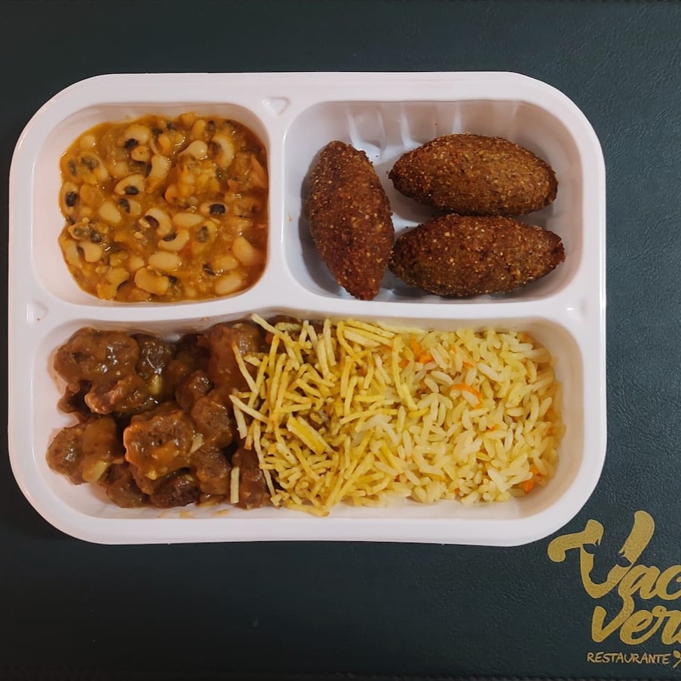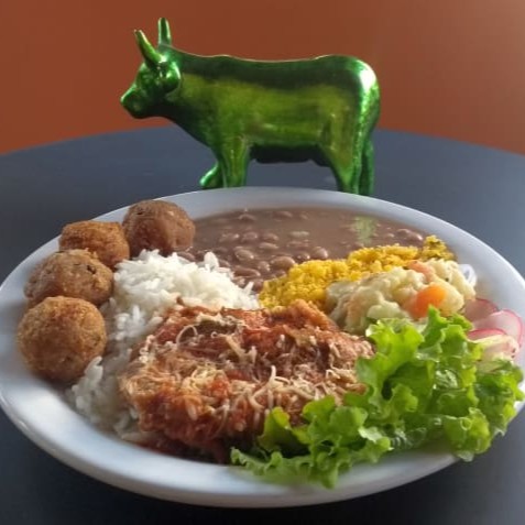 Comida saborosa 100% vegan com 1 bife de proteína de soja à milanesa, 3 bolinhos Vaca Verde (de arroz, legumes e especiarias), purê de batata, farofa acebolada, arroz branco (ou integral), feijão carioca, salada com maionese. Inclui embalagem de 4 divisórias, guardanapo e sachê de sal. Os talheres (opcionais) são cobrados à parte. Refeição com cerca de 550 g. Contém glúten e derivados de soja.