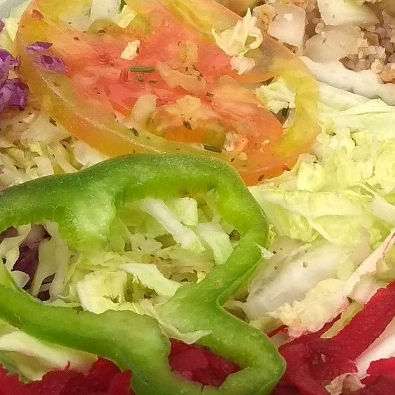 Seu pedido é uma ordem! Um mix daquela saladinha refrescante para complementar sua refeição. Ao todo, são três opções, como tabule, maionese vegan, vinagrete, alface, tomate ou repolho, entre outras. A combinação vai depender do buffet diário do restaurante Vaca Verde. All vegan :)