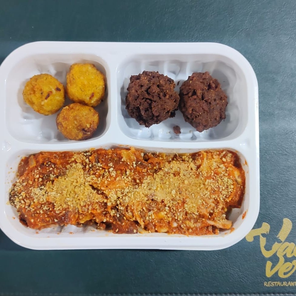 Aí sim! Vem com uma berinjela à parmegiana (com molho de tomate natural e queijo vegano); arroz branco (ou integral), 4 bolinhos vaca verde (de arroz com mix de legumes e feijão); e salada mix com maionese. Os talheres são opcionais e cobrados à parte. Acompanha embalagem de 3 divisórias, guardanapo e sachê de sal. Refeição média com cerca de 400g 100% vegan. Imagem meramente ilustrativa. Contém g