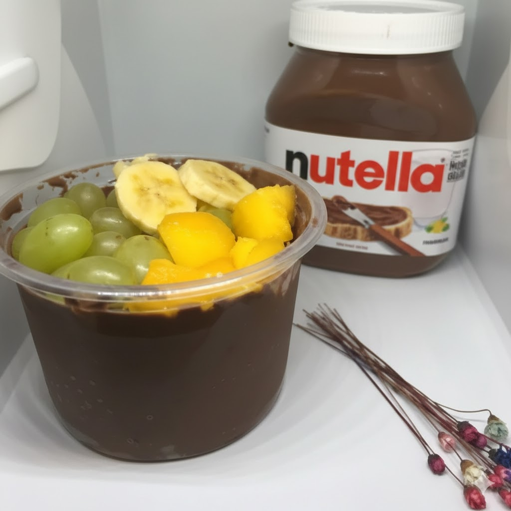 Nosso açaí trufado com Nutella é servido no pote de 500 ml, a Nutella é passada em toda a lateral do pote , uma camada no meio e uma em cima, as frutas a sua escolha são enviadas por cima para não congelar e mantê-las frescas, os adicionais pagos são enviados em copo separado.